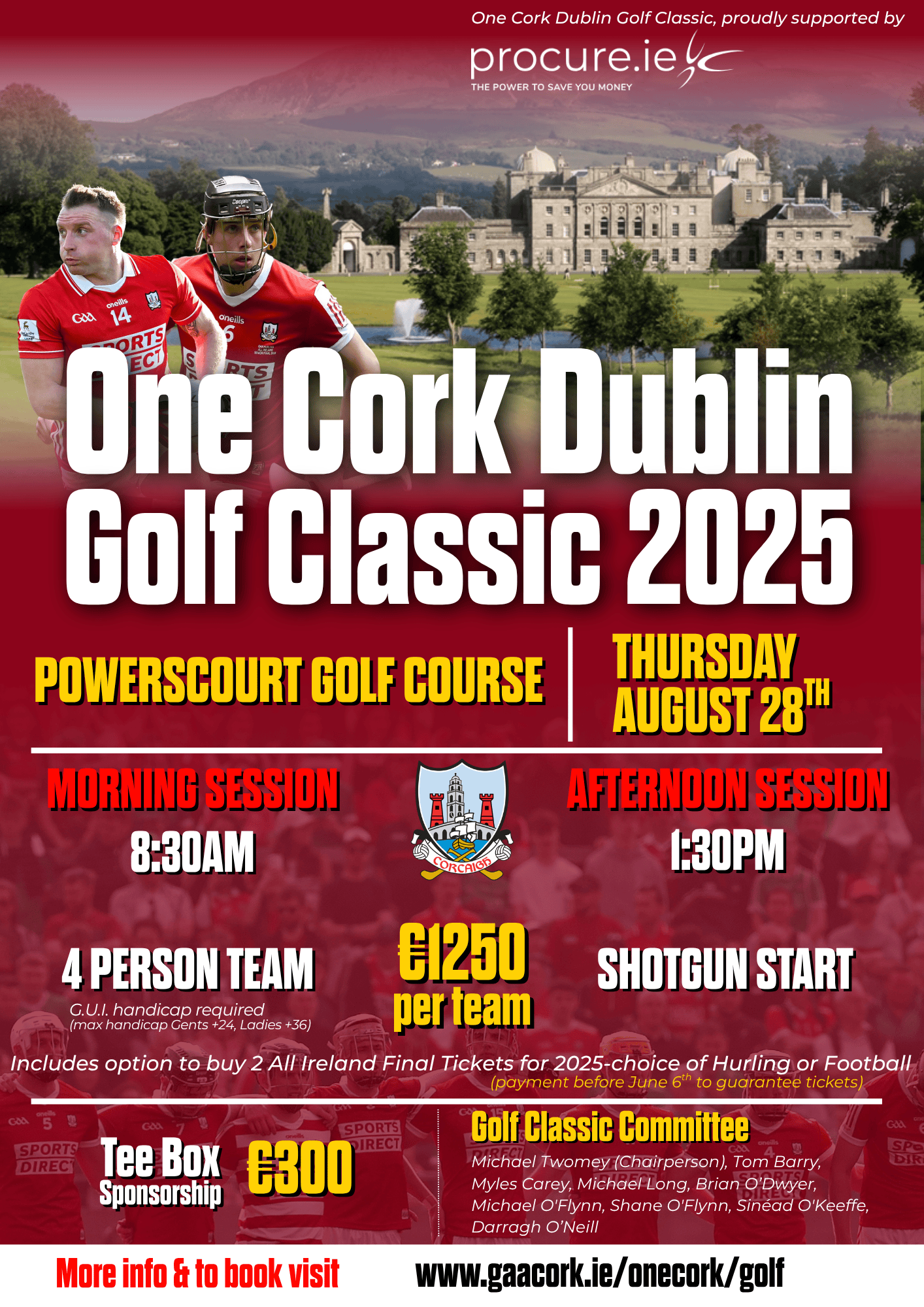Cork GAA is thrilled to invite supporters, sponsors, and friends to the One Cork Dublin Golf Classic 2025, proudly supported by Procure.ie. Set in the stunning surrounds of Powerscourt Golf Club, this unmissable event will take place on Thursday, August 28th, offering the perfect blend of competitive golf, scenic views, and support for Cork GAA’s continued progress on and off the pitch.