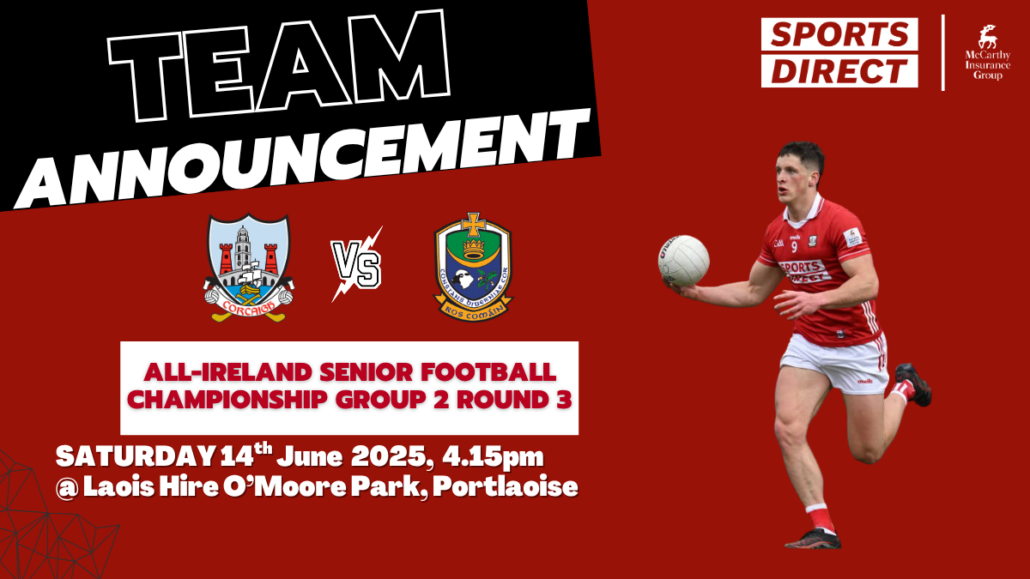 The Cork Senior Football team to play Roscommon in Group 2, Round 3 of the All-Ireland Championship at Laois Hire O’Moore Park, Portlaoise on Saturday 14th June at 4.15pm has been announced;