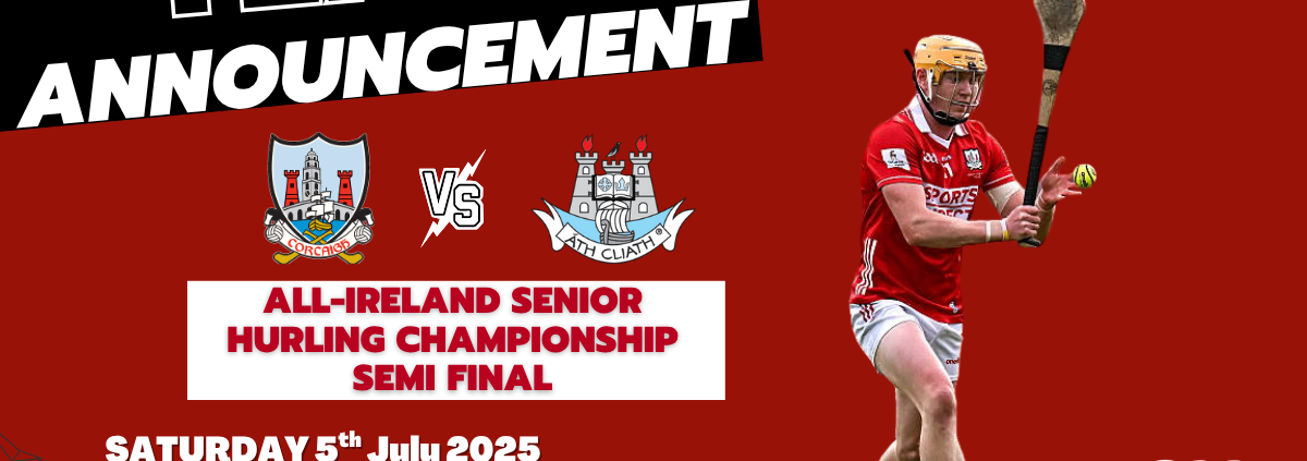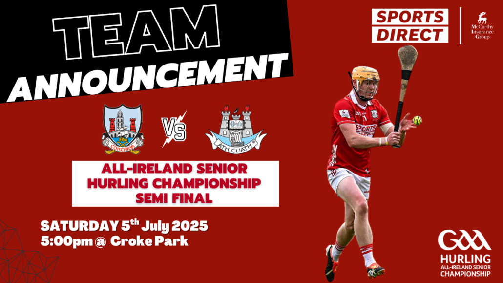 The Cork Senior Hurling team to play Dublin in the All-Ireland Semi-Final at Croke Park, Dublin, on Saturday 5th July at 5pm has been announced;