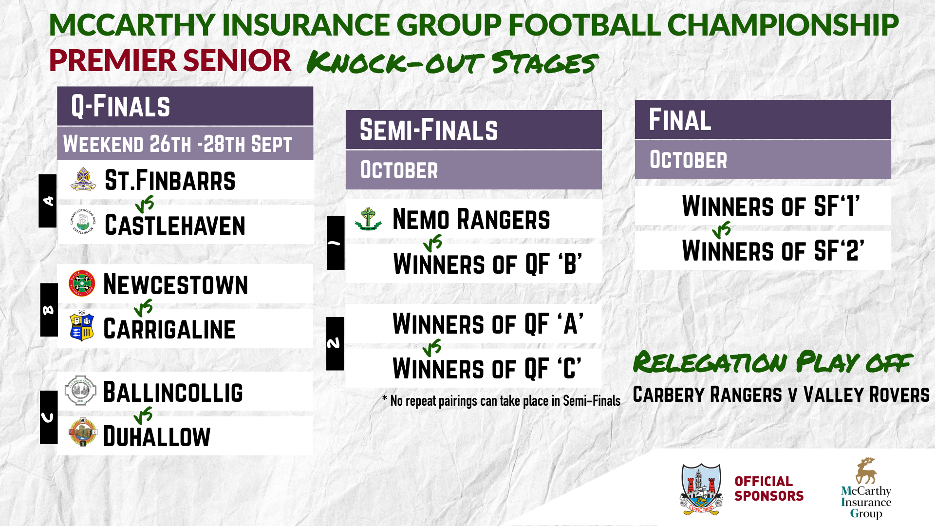 Following the conclusion of the group stages, the McCarthy Insurance Group Premier Senior Football Championship Knockout Draw is confirmed!