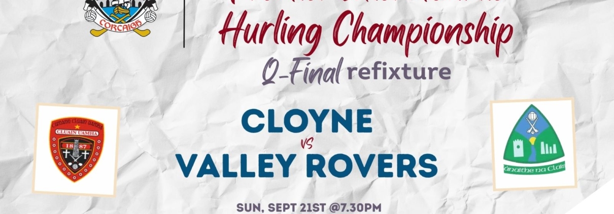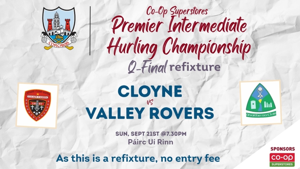 Cork GAA has announced the refixture details for the Co-Op Superstores Premier Intermediate Hurling Quarter Final:
