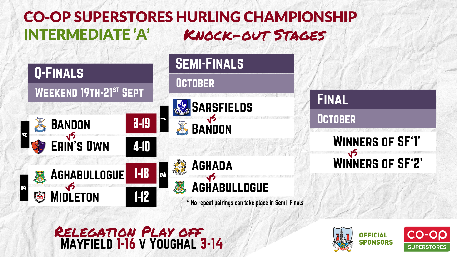 In the relegation play-off, Youghal secured their Intermediate A status with a hard-fought win over Mayfield. Goals proved decisive as Youghal ran out 3-14 to 1-16 victors, condemning Mayfield to relegation.