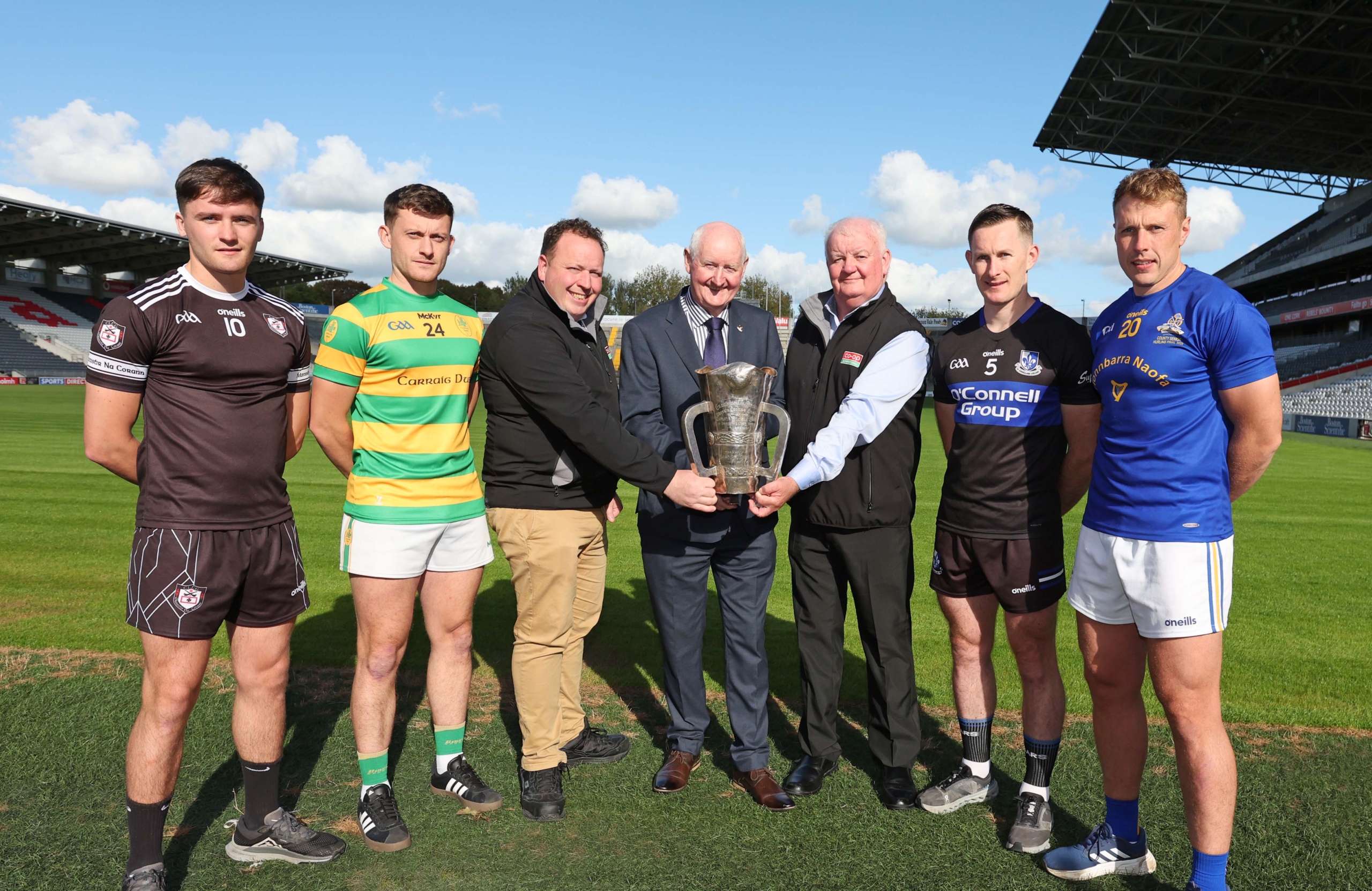 Pictured are Pat Horgan, Chairperson Cork Gaa, John Kiely, Manager Co Op Superstores Midleton Branch and Brian Taylor, Regional Area Manager Co Op Superstores with David Cremin, Midleton, Alan O’Callaghan, Blackrock, Bryan Murphy, Sarsfields and Eoin Keane, St. Finbarrs, ahead of the Co Op Superstores 2025 Premier Senior Hurling Championship Semi Finals, at SuperValu Pairc Ui Chaoimh, Cork.
