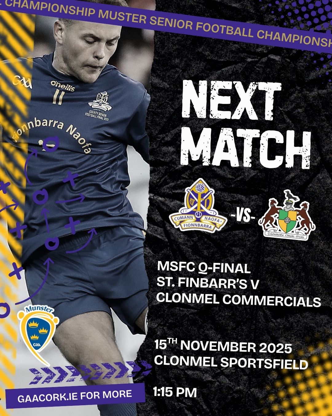 St. Finbarr’s travel to Clonmel aiming to book their place in the Munster Semi-Final. Best of luck to The Barrs as they represent Cork on the provincial stage.