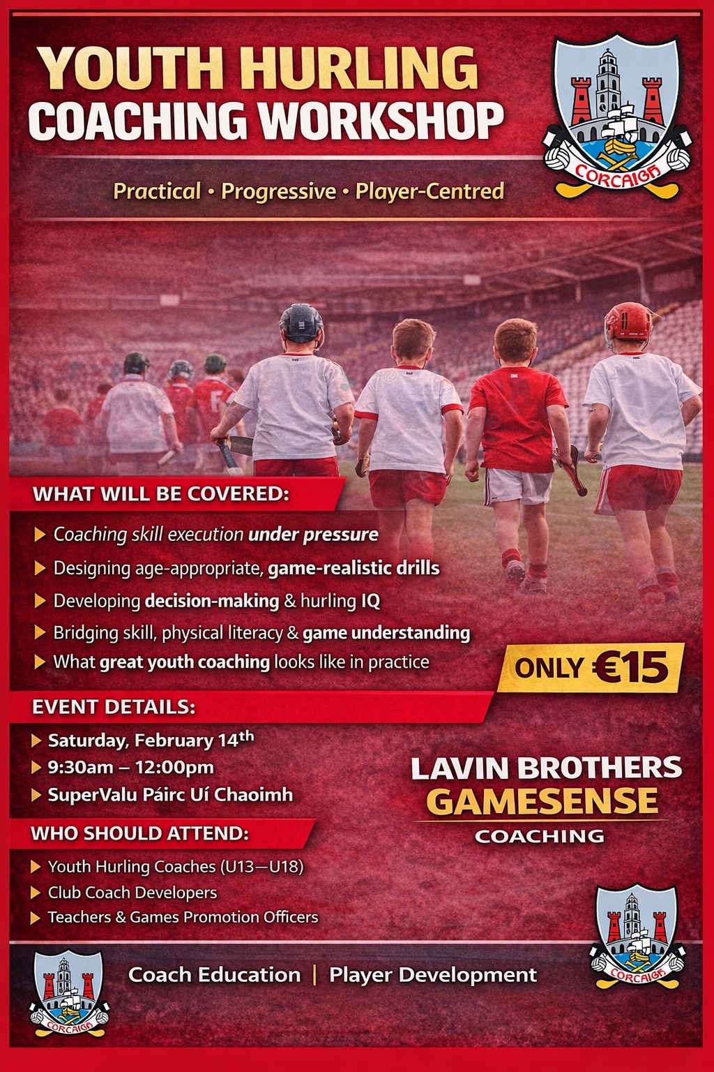 The Lavin Brothers of GameSense Coaching will deliver a practical Youth Hurling Coaching Workshop on Saturday, February 14th at SuperValu Páirc Uí Chaoimh.