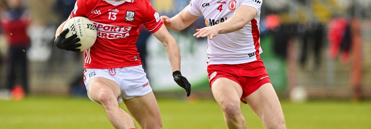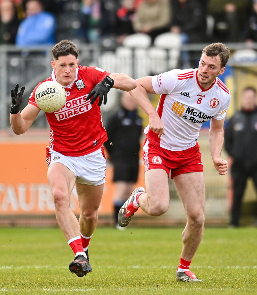 Cork faced into a gusting breeze, but established a platform around midfield with an aggressive press on the Tyrone kcik-out, easing ahead through Mark Cronin, Colm O’Callaghan, and Stephen Sherlock.