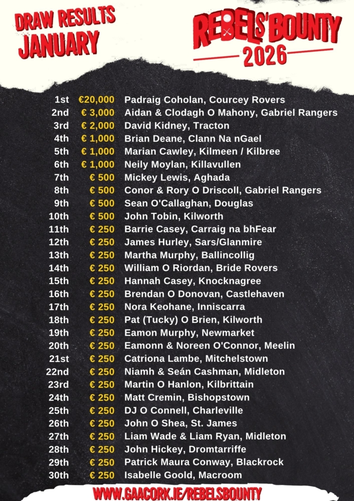 A huge congratulations to all of our winners and thank you to everyone who continues to support Rebels’ Bounty and Cork GAA.