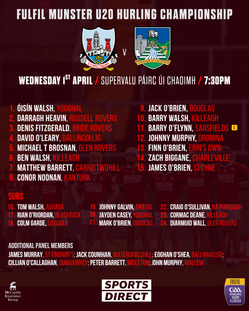 Cork will play Limerick at home in Round 2 of the 2026 Munster Under 20 Hurling Championship on Wednesday, April 1st at SuperValu Páirc Uí Chaoimh, with a 7:00pm throw-in.