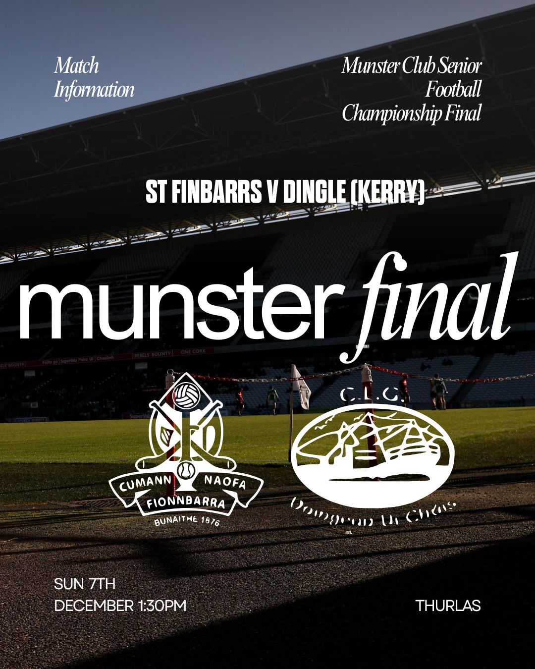 St Finbarrs are set to battle Dingle (Kerry) in the AIB Munster Club Senior Football Championship Final on Sunday, December 7th at 1:30pm in FBD Semple Stadium, Thurles.