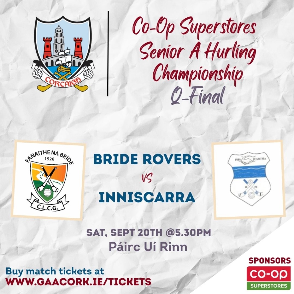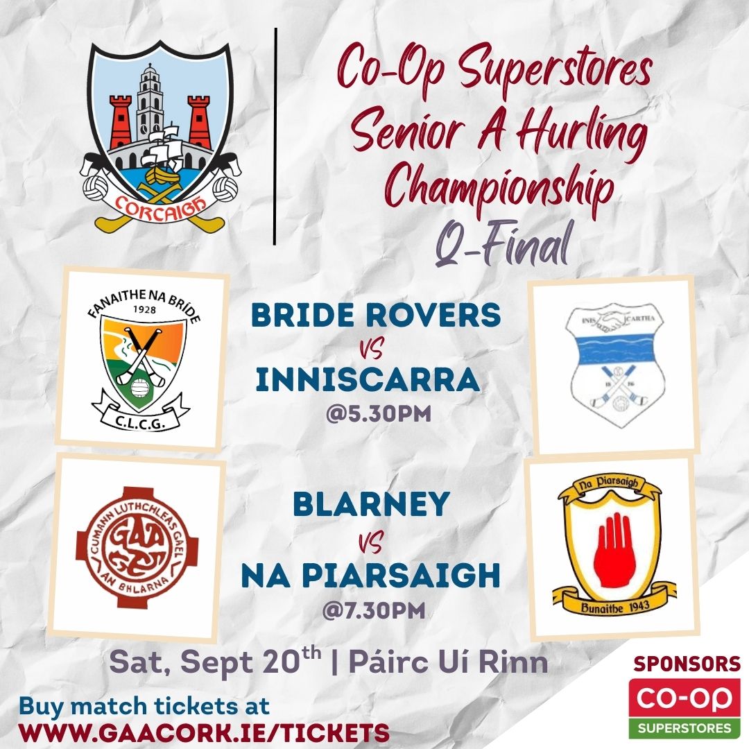 Bride Rovers and Inniscarra, followed by Blarney and Na Piarsaigh, will meet in a double-header of the Co-Op Superstores Senior A Hurling Championship quarter-finals.