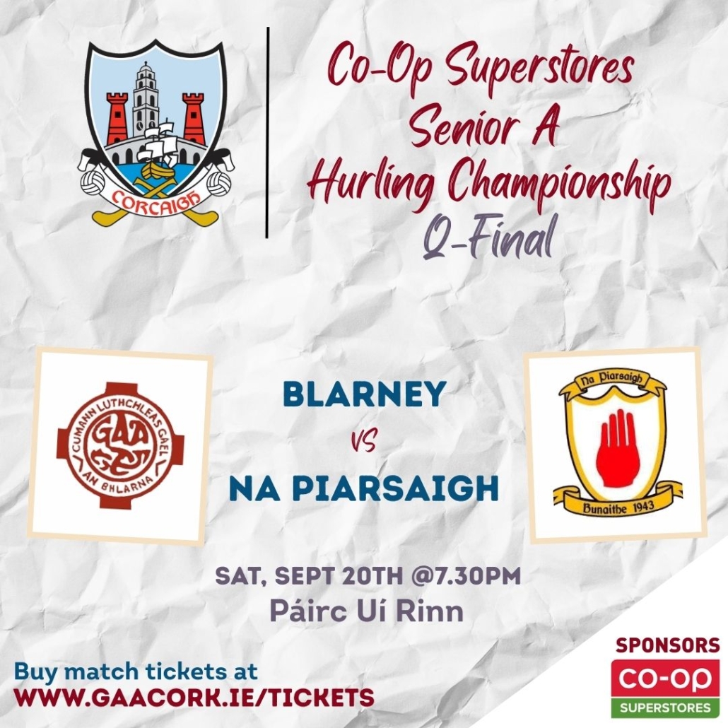 Bride Rovers and Inniscarra, followed by Blarney and Na Piarsaigh, will meet in a double-header of the Co-Op Superstores Senior A Hurling Championship quarter-finals.