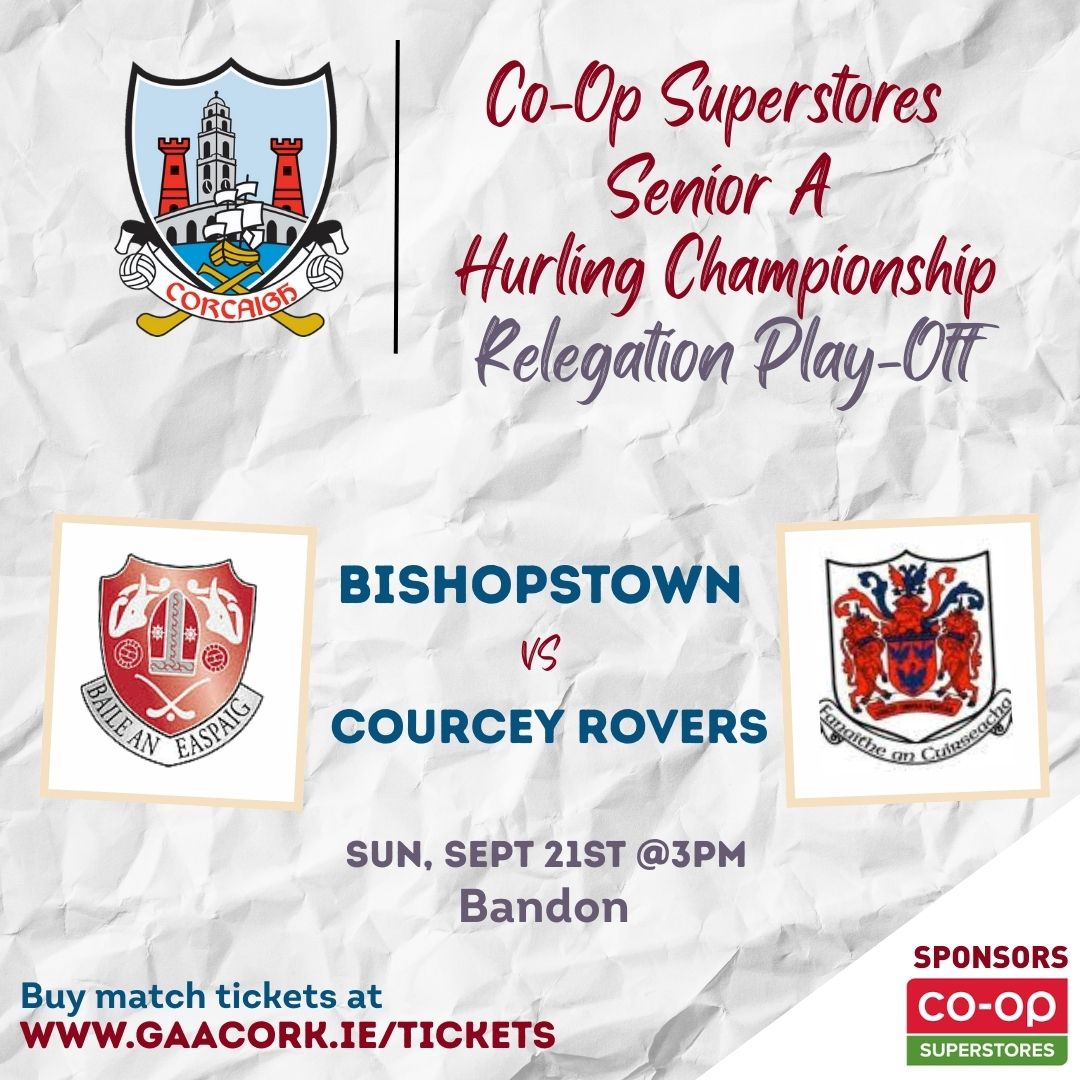 BandonBishopstown and Courcey Rovers will meet in the relegation playoff of the Co-Op Superstores Senior A Hurling Championship.